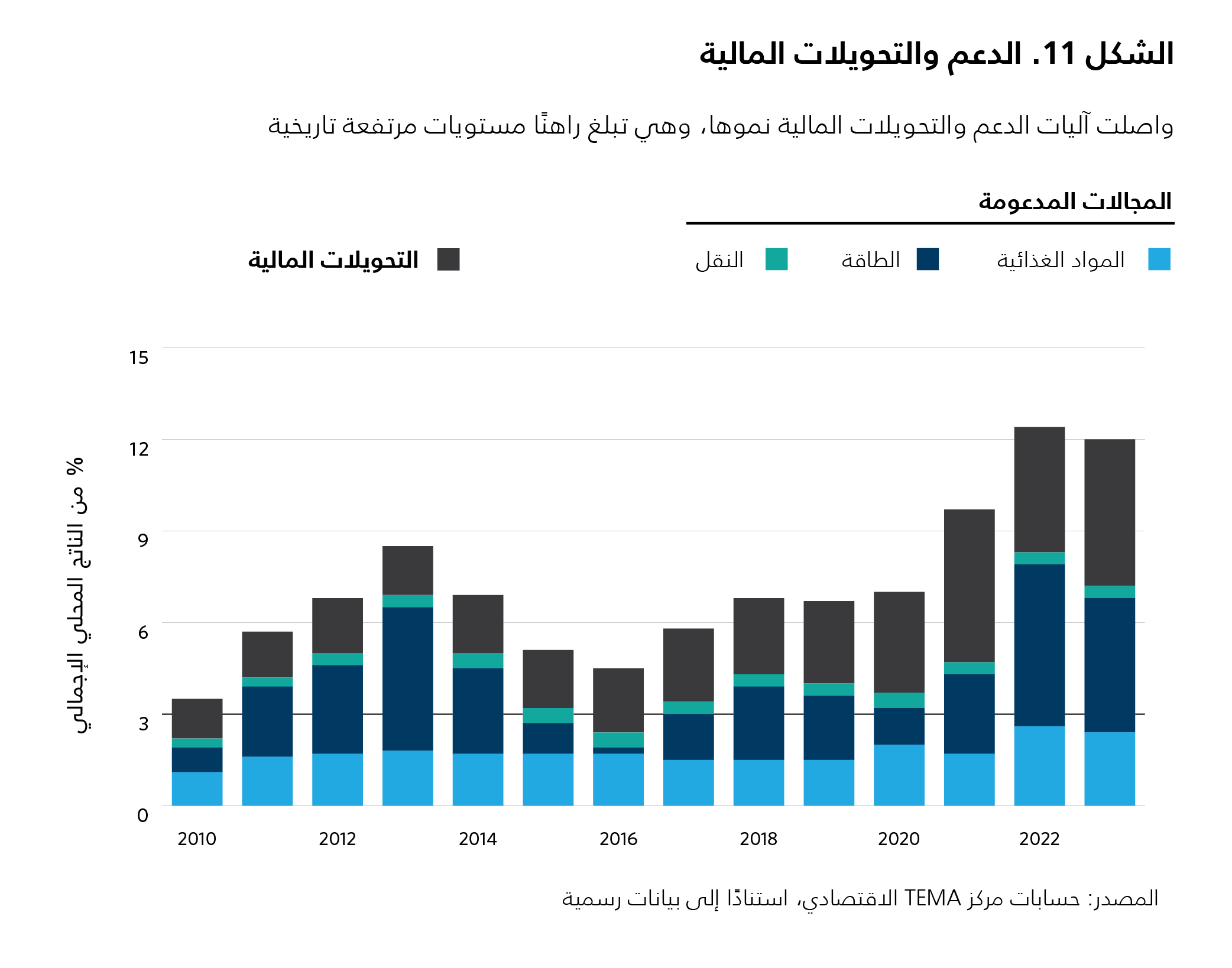 واصلت نسبة التحويلات المالية والدعم ارتفاعها لتصل إلى 12 في المئة من الناتج المحلي الإجمالي في العام 2022 (انظر الشكل 11)، وهي من بين أعلى النسب في منطقة الشرق الأوسط وشمال أفريقيا. لقد اتّسع نطاق السياسات الاجتماعية بصورة تدريجية بعد العام 2011، بيد أن السنوات القليلة الماضية شهدت ارتفاعًا حادًّا في الدعم للتخفيف من حدّة التداعيات الناجمة عن ارتفاع أسعار المواد الغذائية ومصادر الطاقة العالمية. تشمل السلع التي يغطيها الدعم بشكل أساسي المنتجات البترولية والكهرباء والغاز والحبوب، وقد ارتفعت تكاليفه من 2.4 في المئة من الناتج المحلي الإجمالي في العام 2010 إلى 6 في المئة في العام 2018، لتتجاوز نسبة 10 في المئة في العام 2022 (انظر الشكل 11). وبلغت نسبة التحويلات – أي التحويلات المالية الاجتماعية والتمويل المخصّص للشركات المملوكة للدولة على السواء – حوالى 5 في المئة من الناتج المحلي الإجمالي في العام 2022 (انظر الشكل 11).