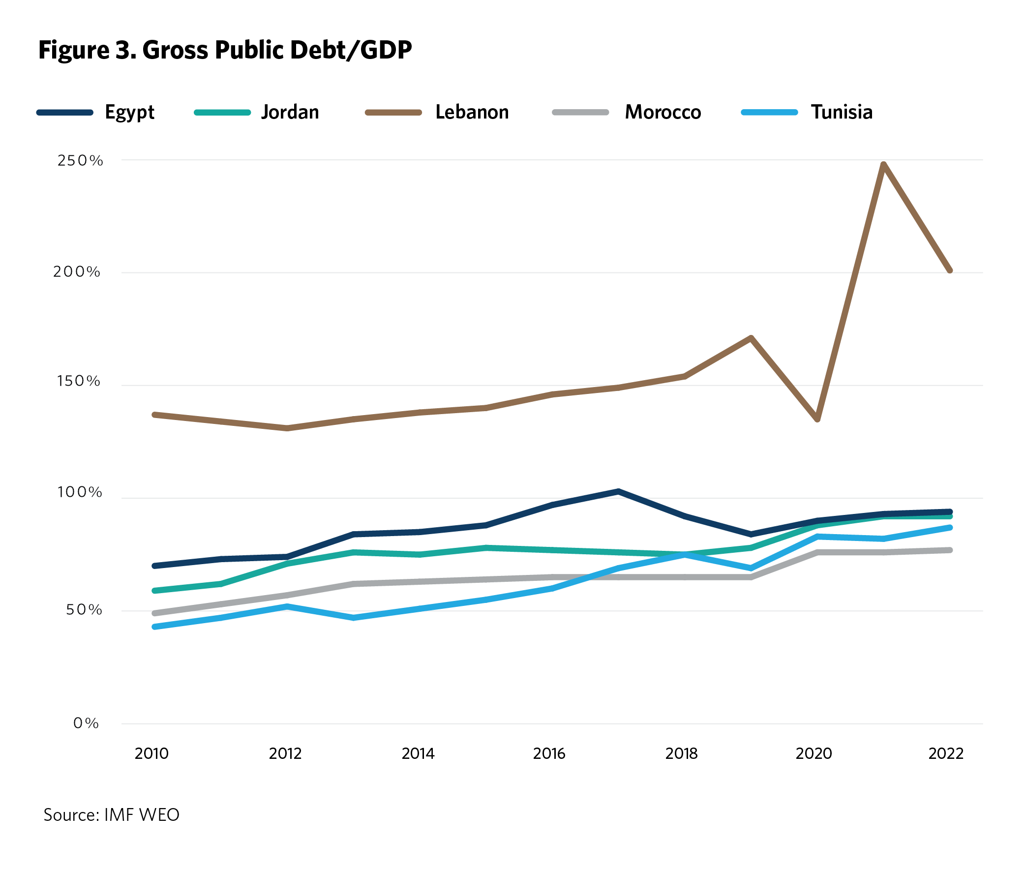 When the coronavirus pandemic struck in 2020, for instance, it caused a severe region-wide economic downturn, prompting MENA governments to intervene to assist businesses and households. This increased state expenditures, but it also coincided with reduced government revenues, leading to wider fiscal deficits. The situation became worse following the outbreak of the Ukraine war, when high levels of import dependency on food and fuel raised the import bills of LMICs, adding to their deficits and debt. At first, countries increased subsidies to ease the impact on households. By then, Egypt, Tunisia, and Lebanon had debt ratios surpassing 80 percent. Moreover, as of February 2022, in an attempt to reduce their trade deficit, increase their foreign currency reserves, and curb the soaring inflation rates driven by energy and food prices, a number of MENA countries devalued their currency and increased domestic interest rates.130 With interest rates surpassing economic growth, and fiscal deficits very high, the countries’ debt dynamics quickly deteriorated.131 This situation exacerbated Lebanon’s financial turmoil, as the country had already defaulted on its foreign debt in 2020, and it created greater uncertainty about Tunisia’s and Egypt’s debt sustainability.