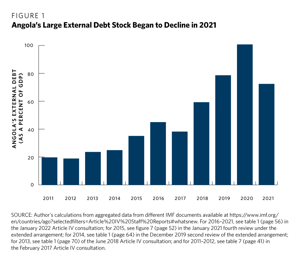 In December 2018, Angola embarked on a three-year IMF program intended to address the fiscal crisis precipitated by the post-2014 collapse in oil prices, following the boom-era borrowing spree. The IMF’s $3.7 billion Extended Fund Facility (later increased to $4.5 billion due to the coronavirus pandemic), was conditional on reforms to the financial sector, changes to the exchange rate management regime, monetary tightening, fiscal consolidation, and improvements in public sector governance. A new debt management strategy also sought to reduce the weight of oil-backed loans, most of which had been contracted from Chinese entities, in the country’s debt stock. These loans are claimed to represent over 50 percent of external debt-servicing costs.